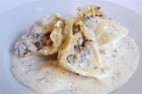 Конкильони с фаршем – это истинный шедевр итальянской кухни, сочетающий нежность пасты и ароматную начинку. Эти крупные ракушки, идеально удерживающие начинку, впервые появились в Неаполе, где паста занимает особое место в кулинарной культуре. Наполненные сочным фаршем с сыром, они приобретают мягкость и насыщенность. Запеченные в сливочно-сметанном соусе с ароматными травами, конкильони раскрывают нежные молочные оттенки, а тянущийся сыр завершает эту симфонию вкусов. Блюдо идеально подходит как для семейного ужина, так и для праздничного стола, подчеркивая уют итальянской кухни. Подавайте с бокалом белого вина и свежей зеленью – насладитесь традициями Средиземноморья!
