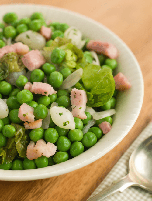 Тушеный горошек с латуком, мятой, беконом и маленьким луком