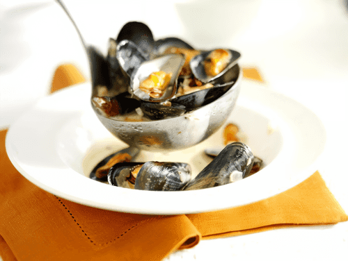 Влейте сливки, посыпьте карри и добавьте еще немного сливочного масла. Хорошо перемешайте, по необходимости посолите и подавайте мидии, полив соусом.