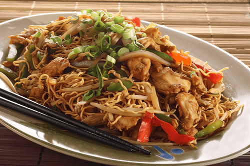 Лапша с индейкой и овощами в кокосово-арахисовом соусе