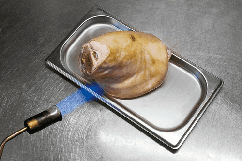 Свиная рулька, или голяшка, бывает передняя или задняя — вторая подходит лучше, потому что в ней больше мяса. Весит она около 1,5 кг. Если на ней замечены остатки щетины, следует опалить ее горелкой или просто зажигалкой — на вкусовых качествах это не скажется, но выглядеть будет аппетитнее.