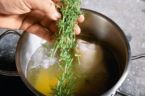 Выбрать глубокую кастрюлю диаметром примерно с рульку, которая будет в ней вариться. Вскипятить в ней 0,5 литра воды, добавить пиво, тимьян, розмарин, перец горошком, душистый перец и щепотку соли. Уложить в кастрюлю голяшку, так чтобы она была целиком покрыта жидкостью, и варить под крышкой на среднем огне около часа.