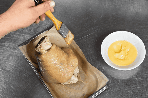 Растопить масло до мягкости — но так, чтобы оно не лилось. Если вы топите сливочное масло с самого начала — дайте ему немного остыть и затвердеть. Вытащить вареную рульку из кастрюли, выложить на противень, застеленный пергаментом, и хорошенько обмазать маслом с помощью кулинарной кисти.