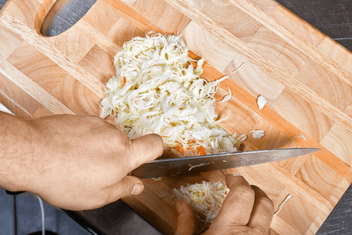 Порубить квашеную капусту на отрезки, которые будет удобно есть вилкой. От капустного рассола при этом избавляться не надо спешить. Разогреть 4 чайные ложки растительного масла, обжарить в нем капусту минуты 3, затем добавить тмин, гвоздику и лавровый лист, долить 50 мл рассола и тушить под крышкой до мягкости.