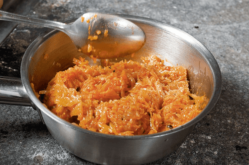 Минут через 15–20 рассол выпарится, тогда следует добавить ложку томатной пасты и, помешивая, слегка обжарить в ней капусту. Когда она станет слегка приставать ко дну сотейника, подлить в него сок половины апельсина и бросить натертое яблоко. Тушить под крышкой еще минут 10, периодически помешивая, пока и апельсиновый сок не впитается в капусту.