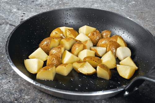 Крупно нарезать картошку — если кожура у нее не слишком грубая, лучше ее не счищать. Отварить в подсоленной воде до готовности, а потом обжарить на растительном масле. Чтобы золотистая корочка покрыла всю ее поверхность, лучше всего научиться подбрасывать ломтики на сковороде прямо на огне.