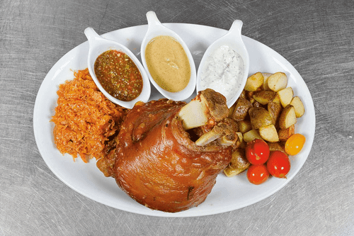 Подавать голяшку целиком на большом блюде вместе с тушеной капустой, ломтиками жареной картошки и соусами — горчицей, хреном и острым томатным. По восточноевропейским меркам все это составит одну порцию — но на самом деле это вопрос комплекции едока.
