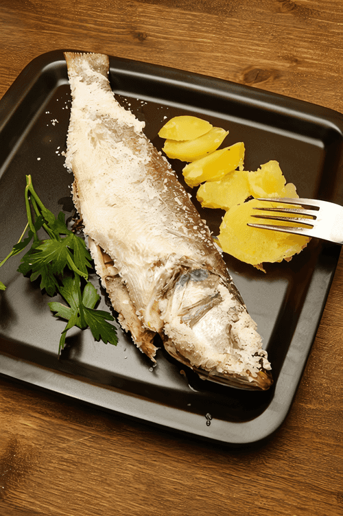 Извлеките рыбу из духовки, ножом разбейте корку и извлеките рыбу. Удалите лишнюю соль.