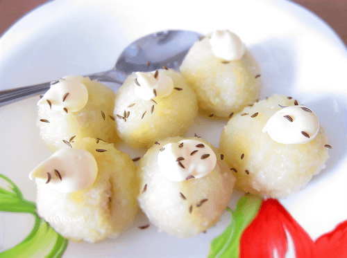 Немного натертого картофеля размять на руке в виде тарелочки и положить туда фарш. Закрепить в виде шарика.