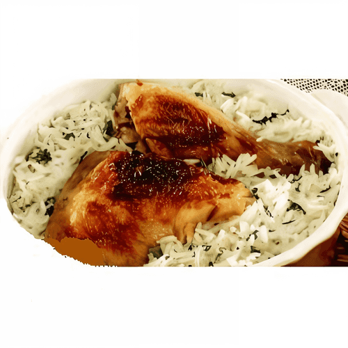 Рис отварите, выложите на дно посуды, в которой запекалась курица, сверху положите курицу и запекайте в духовке в течение 10–15 минут до золотистой корочки. При подаче старайтесь не нарушить слой риса и курицы.