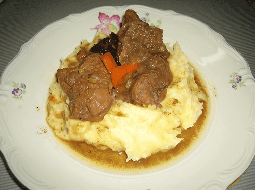 Переложить содержимое сковороды в толстостенную кастрюлю, глубокий сотейник или чугунок. Важно выложить мясо очень плотно в один или 2 слоя, в зависимости от диаметра емкости. Добавить горячую воду в уровень с мясом и поместить емкость в духовку, разогретую до 140 градусов на 2 часа. Хорошего результата можно добиться и на плите. В любом случае нужно, чтобы посуда была прикрыта крышкой так, чтобы щель была минимальной, а жидкость даже не кипела, а была «чуть живой».