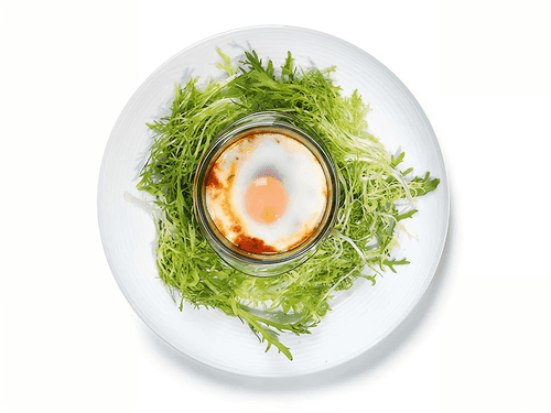 Разбить сверху яйцо. Положить кусочек сливочного масла. Запечатать форму фольгой и поставить на десять минут в духовку. Подавать с салатом фризе.
