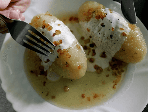 Для соуса сало порезать кубиками и жарить, пока не растопится. При желании готовые цеппелины можно обжарить на растительном масле. Перед подачей цеппелины полить соусом.