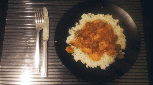 Разложите куски курицы в сковороде. Добавьте оливки и оставшееся масло. Посолите и поперчите смесь. Залейте все куриным бульоном или водой. Готовьте минут 30, пока соус не загустеет, а курица не приготовится.