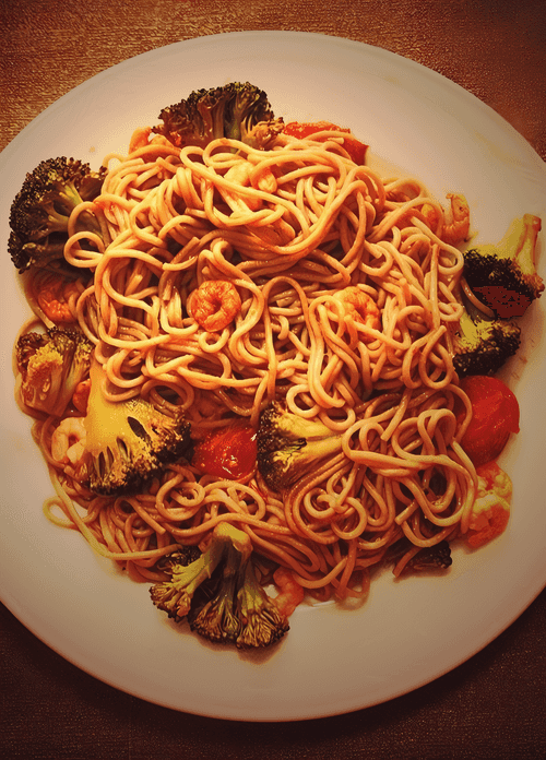 Гречневая лапша с креветками, брокколи и помидорами черри