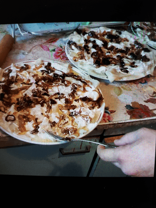 На широкую тарелку выложить сваренное тесто, сверху соус из простокваши, сверху пассерованный лук.