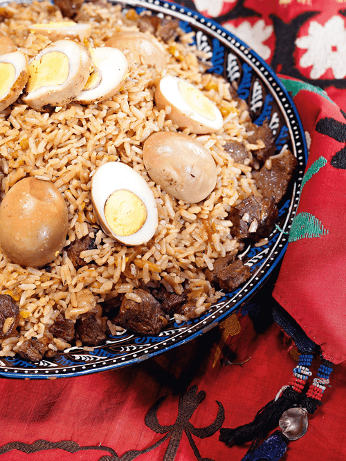 Сделать ферганский плов, следуя <a href="http://eda.ru/recipe/13859/">рецепту</a>, вплоть до пятого пункта. После того как в курдючном жире будет обжарено мясо с овощами, сгрести все это в одну сторону на стену казана, а на дне в жире обжарить вареные яйца, переворачивая их, чтобы вся их поверхность покрылась золотистой патиной. Тогда накрыть их мясом и овощами, залить водой и дальше следовать рецепту.