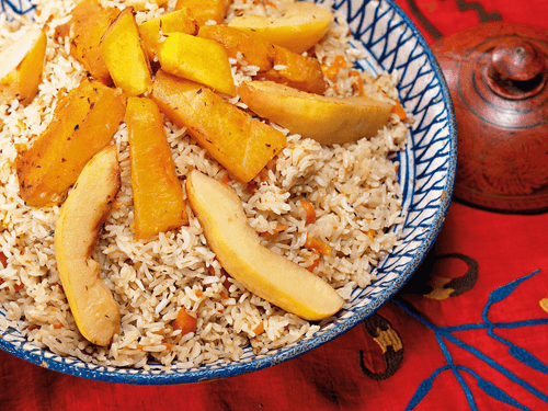 Готовый рис перемешать с зирваком, выложить на блюдо и сверху разложить куски тыквы и айвы.