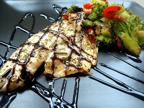 Пока тушатся овощи, хорошо промойте рыбу и выложите ее на фольгу, смазанную оливковым или же простым маслом. Выжмите лимонный сок и смажьте рыбу (если есть купленный, то можно использовать и его). Затем посолите и поперчите, а сверху выложите листья базилика. Хорошо заверните в фольгу и поставьте в духовку на 20 минут.
