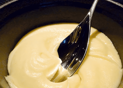 Тем временем маленькую сковородку ополоснуть под водой, слить остатки воды и, не вытирая насухо, влить в нее молоко. Довести почти до кипения и держать горячим.