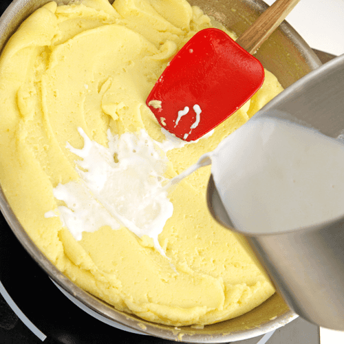 Когда масло исчезнет, влить горячее молоко и, так же с силой разминая картошку, добиться однородности получающегося пюре. Попробовать пюре на вкус — и приправить солью и свежемолотым черным перцем.