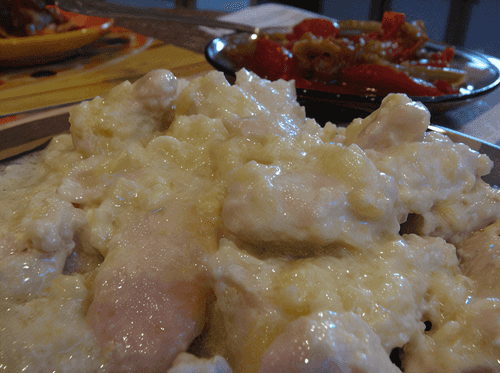 Вылить соус на поджаренную курицу и распределить, чтобы кусочки были полностью (по возможности) покрыты.