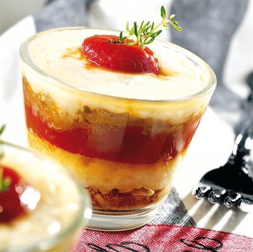 Посыпать орегано и покрыть сверху слоем картофеля, после чего повторить все слои. Закрыть стаканчики крышками. Варить на пару в течение 30–35 минут. Непосредственно перед подачей блюда снять крышки со стаканчиков и положить немного томатной пасты и небольшую веточку тимьяна в каждый из них.
