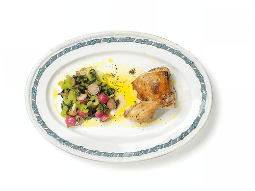 Вынуть окорочка из духовки, разрезать в том месте, где голень соединяется с бедром, и подавать с овощным гарниром.