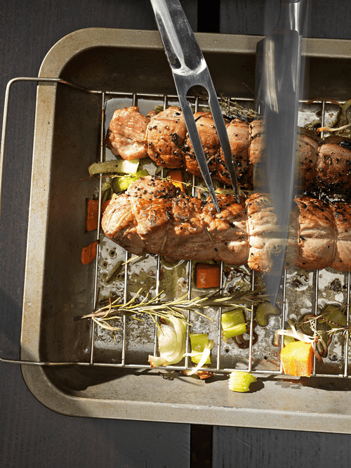 Выложить свинину на противень, добавить овощи и розмарин и отправить на 20 минут в духовку, разогретую до 180 градусов.