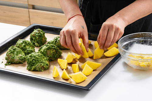 Картошку нарезать дольками, сбрызнуть растительным маслом, посолить и поперчить.