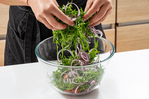 Смешать лук с руколой и половинками помидоров.
