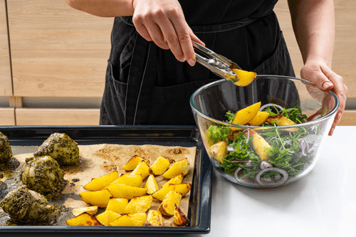 Достать противень с картошкой и курицей, картошку смешать с салатом из руколы, помидоров и лука. Заправить соусом песто.