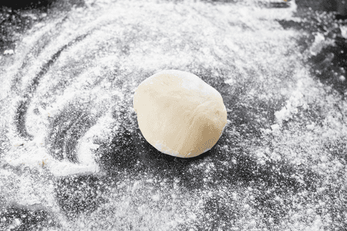 Сделать из теста полусферу, замешивая таким образом, чтобы все трещинки и неровности оказались снизу: то есть края нужно постоянно подворачивать внутрь. Теста должно получиться около 800 грамм, этого хватит на десять порций пельменей или вареников — из расчета, что в каждой порции примерно десять штук.