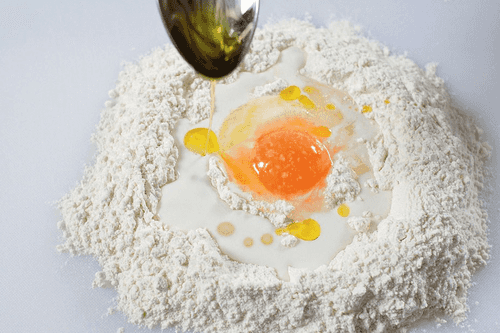 Насыпать муку в миску небольшой горкой. Сверху сделать ложкой маленькое углубление и разбить в него 2 яйца. По периметру прочертить бороздку, влить туда молоко, добавить 20 грамм соли и растительное масло. Замесить тесто вручную (или с помощью тестомешалки кухонного комбайна довести до грубой консистенции, а затем домесить вручную).