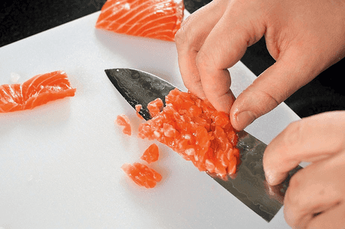 Рыбу разделать, филе (около 180 грамм судака и 450 грамм лосося) нарезать мелкими кубиками, а из голов, костей и хвостов сварить бульон, в котором пельмени нужно будет подавать (но не варить): положить все в холодную воду, добавить нарезанные репчатый лук, порей, морковь и раздавленный зубчик чеснока. Посолить и поперчить. Как только вода закипит, убавить огонь до минимума.