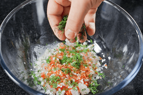 Чтобы рыбный бульон был наваристым, нужно готовить его на медленном огне около 5 часов, но можно ограничиться меньшим временем. Подготовить начинку для пельменей: к филе рыбы добавить мелконарезанные белки 3 отваренных яиц, жареный лук, сливки, оливковое масло и покрошить туда же 2 ветки укропа. Посолить и поперчить по вкусу, хорошо все перемешать.