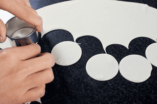 Тесто достать из холодильника, раскатать скалкой до толщины 1–2 мм и с помощью кулинарного кольца диаметром 4,5 см или любого другого предмета подходящей формы с острыми краями вырезать из него кружки.
