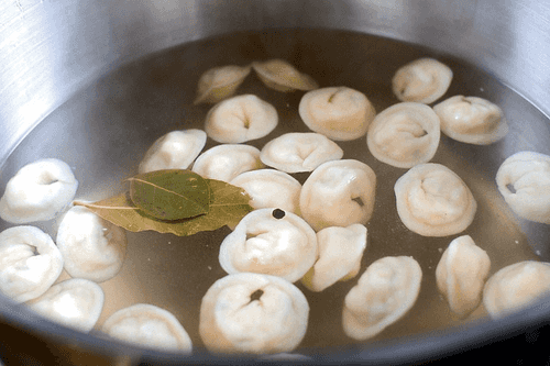 Отваривать пельмени в течение 5–6 минут в 5 литрах воды с 50 граммами соли, лавровым листом, 2 раздавленными зубчиками чеснока, горошинами черного перца и 3 целыми веточками укропа.