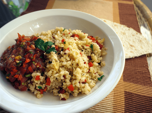 Булгур с сальсой — это яркое и ароматное блюдо, объединяющее итальянские традиции и свежесть средиземноморских ингредиентов. Булгур, известный своей питательностью и ореховым вкусом, готовится с добавлением сладкого перца и лука-порея, создавая насыщенный и слегка сладковатый оттенок. Свежая мята придаёт блюду легкость и освежающий аромат, а соус сальса добавляет пикантные нотки и гармонично балансирует текстуры. Исторически булгур широко использовался в кухне Средиземноморья, а сочетание его с сальсой представляет современный гастрономический взгляд на традиционные ингредиенты. Это блюдо идеально подходит как для лёгкого ужина, так и в качестве гарнира к мясным и рыбным блюдам, наполняя трапезу солнечным настроением и богатством вкусов.