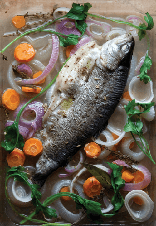 Форель пашот с луком и семенами укропа