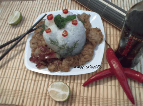 Для приготовления кисло-сладкого соуса 2 столовые ложки растительного масла разогреть в сковороде, добавить толченый чеснок, нарезанную луковицу и слегка обжарить (2–3 минуты), затем влить 0,5 стакана бульона (или горячую воду), добавить 1 столовую ложку уксуса, 2 столовые ложки сахара, перец красный молотый, перчик чили, мелко порезанный, сок лайма и 2 столовые ложки соевого соуса.