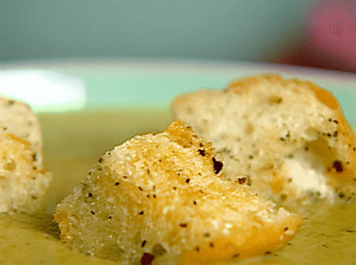 Тем временем, нагреть в большой сковороде 2 столовые ложки оливкового масла. Снизить огонь до среднего и обжарить нарезанный 2 см толщиной багет до приятного коричневого цвета. По желанию крутоны можно посолить и поперчить по вкусу.