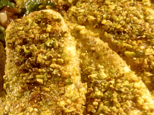 Дорада в фисташковой корочке с мангольдом, варенной ветчиной, сыром горгонзола и кедровыми орешками