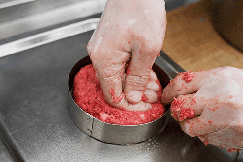 Говядину пропустить через мясорубку, добавить масло, столовую ложку кетчупа, посолить и поперчить. Перемешать руками (если пользоваться комбайном, мясо будет волокнистым) до однородности. Сформировать котлету: заполнить фаршем кулинарное кольцо и утрамбовать.