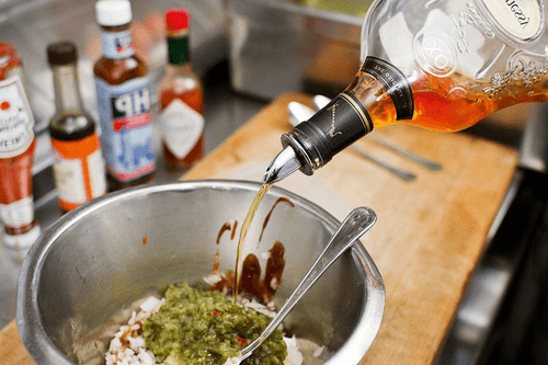 Очень мелко нарезать маринованный огурец, измельчить белый лук. Смешать огурец и лук с майонезом, половиной столовой ложки кетчупа, соусом HP, табаско и вустерширским соусом. Добавить главный ингредиент — коньяк.