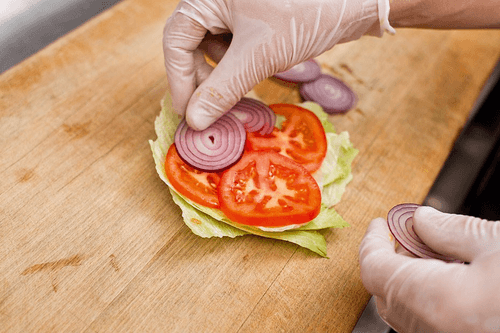 Половину помидора и красный лук нарезать тонкими кольцами. Листья салата «Айсберг» аккуратно, стараясь не повредить, сложить в виде лодочки. Выложить на салат слайсы помидора и красного лука, слегка примять руками.