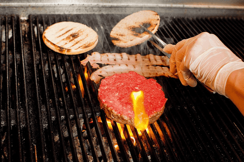 Мясо, булочку и бекон поджарить на гриле (подойдет и сковорода гриль). Булочке достаточно тридцати секунд, чтобы подрумяниться, бекону — полминуты с каждой стороны, а средняя степень прожарки мяса потребует минут четырех-пяти. За минуту до готовности положить на котлету сыр и дать ему расплавиться.