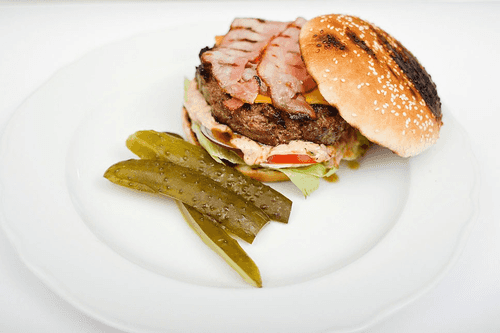 На половине поджаренной булочки разместить лодочку из салата с ломтиками помидора и лука, полить двумя-тремя столовыми ложками соуса, сверху выложить котлету с сыром чеддер и бекон, накрыть второй половиной булочки. Гарниром к гамбургеру будет маринованный огурец, разрезанный на четыре части.