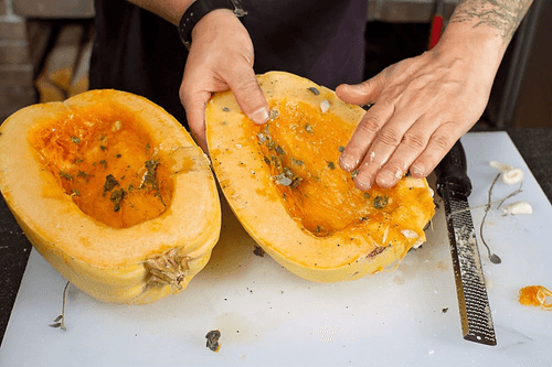 Уложить половинки тыквы на застеленный фольгой противень мякотью вниз. Поставить в разогретую до 175 градусов духовку. Примерно за час (чуть больше или меньше — в зависимости от веса овоща) он дойдет до нужной кондиции — вилка должна легко входить в мякоть.