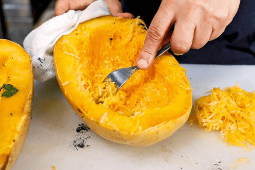 Через час вынуть сквош из духовки, дать ему немного остыть и перевернуть мякотью вверх. Теперь каждую половину надо выскрести вилкой — вы увидите, как из-под нее будет выходить довольно длинная лапша, те самые спагетти, давшие название овощу.